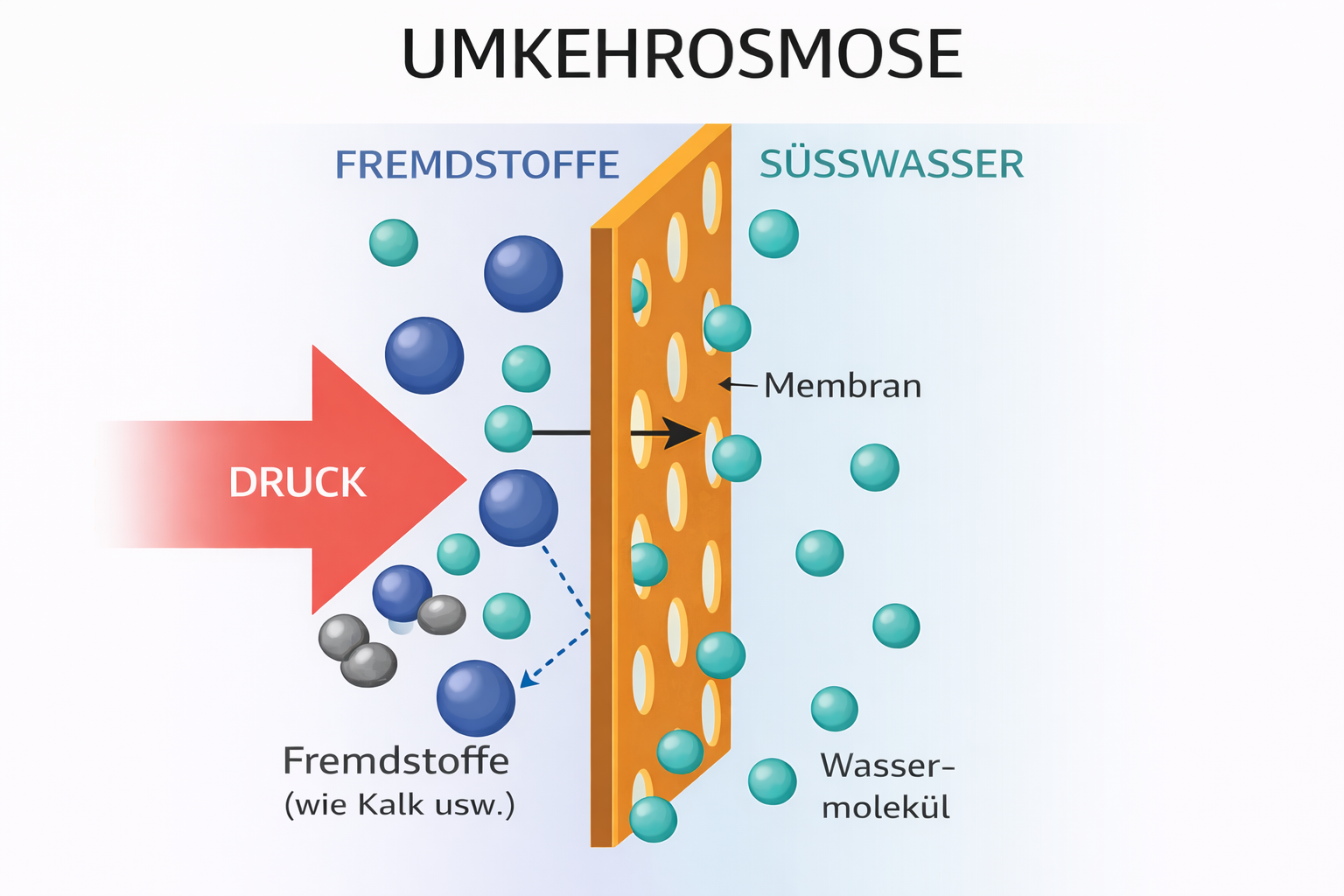Dabei wird Wasser mit Druck durch eine extrem feine Membran gepresst. Diese Membran ist so fein, dass nur Wassermoleküle hindurchpassen. Viele andere Stoffe werden dabei zuverlässig zurückgehalten.